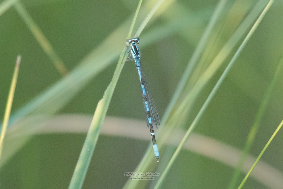 Самец стрелки стройной Coenagrion johanssoni (Wallengren, 1894), присевший на травинку. Озеро Большое Лебединое, Заволжье, Чувашия. 15 Июня 2023 года. Фотография Александра Алексеевича Яковлева (страничка https://www.inaturalist.org/observations/167656739).