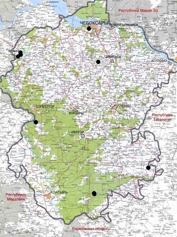 Места наблюдений и находок дедки обыкновенного на территории Чувашии.