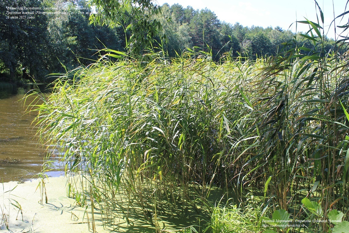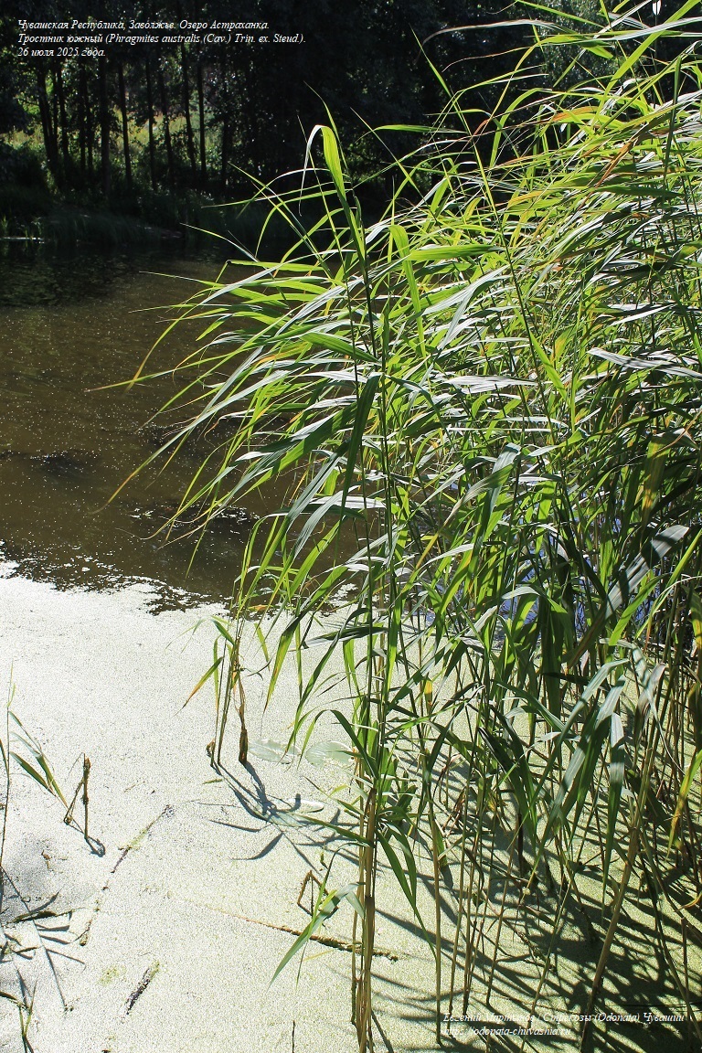 Многие участки берега Астраханки поросли тростником южным (Phragmites australis (Cav.) Trin. ex. Steud.); чуваш. название - мелке хăмăш. Особенно густые заросли тростника прослеживаются на восточном берегу озера (что особенно хорошо заметно с запада водоёма (см. “Ещё виды озера”)). На фотографии - тростник крупным планом; на дополнительном фотоснимке - заросли тростника.