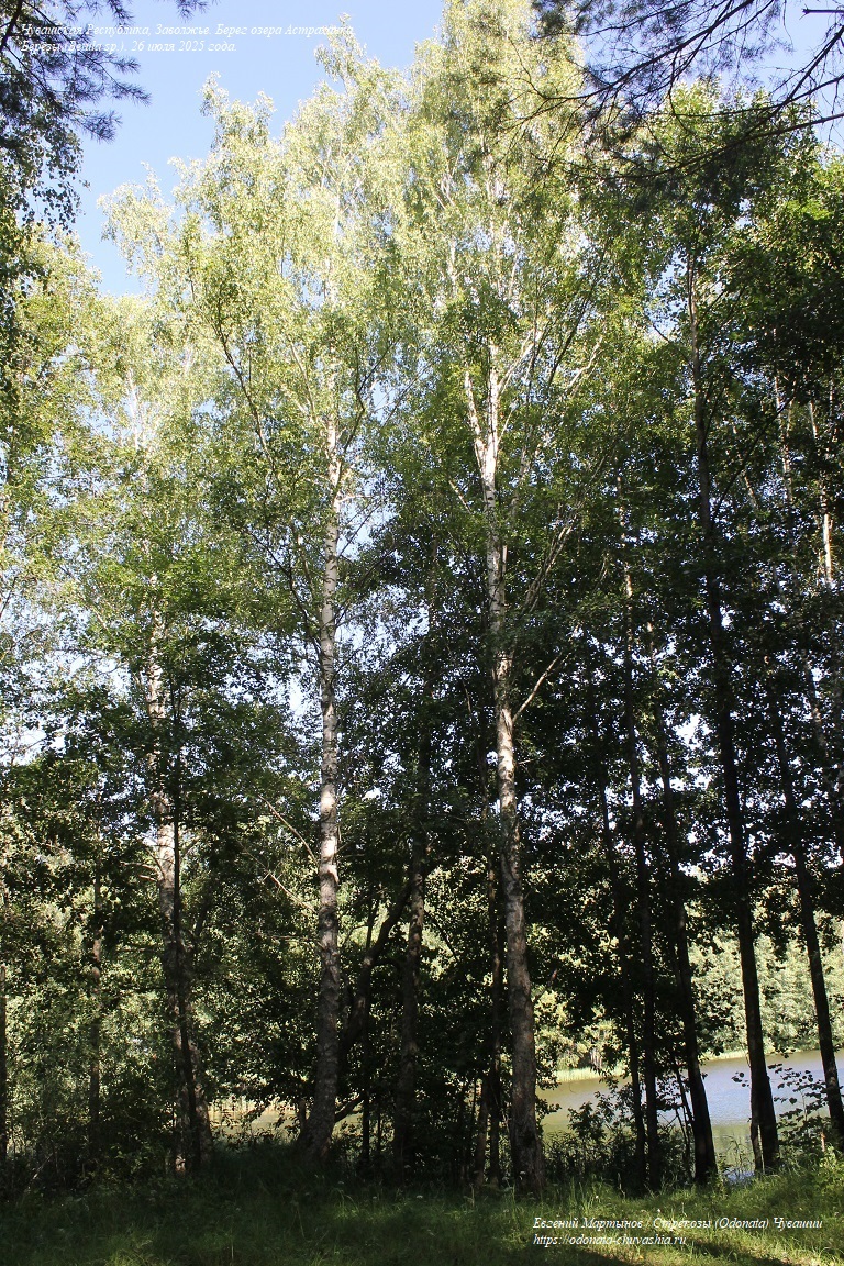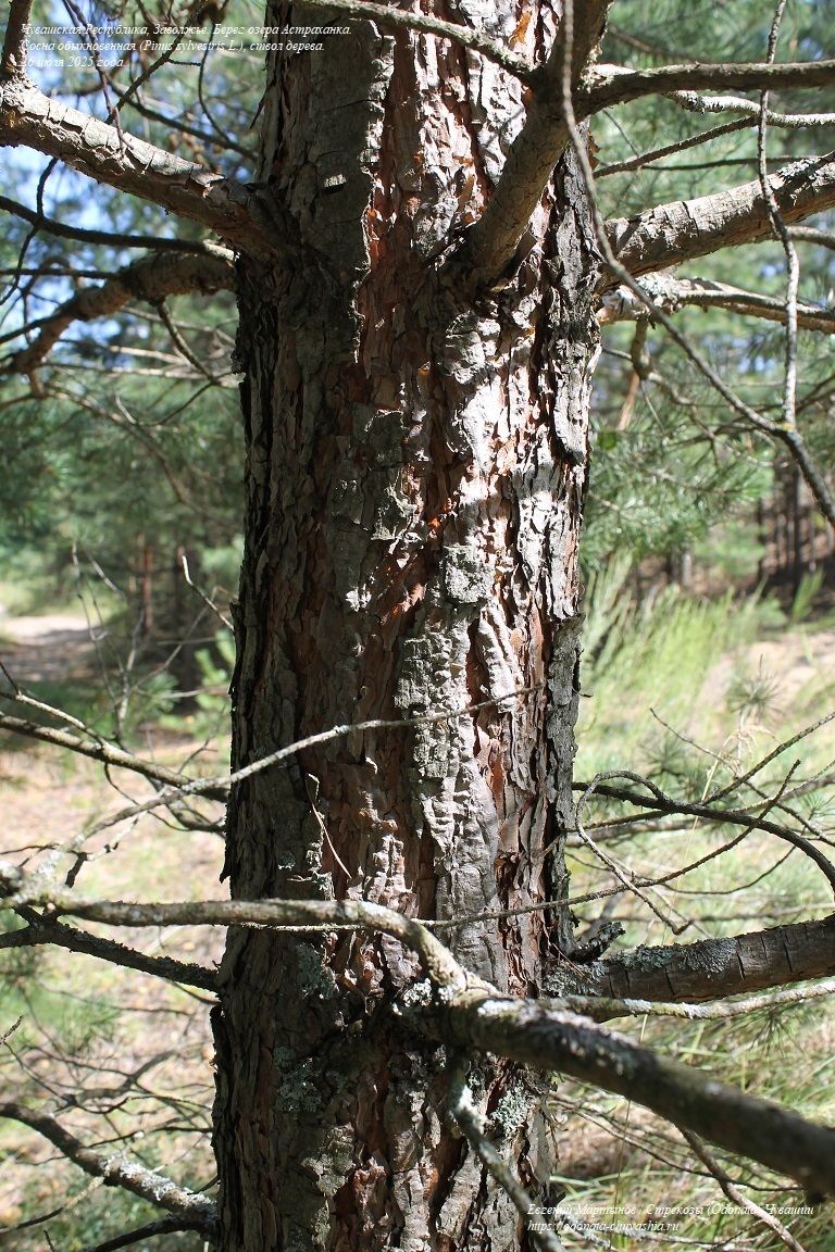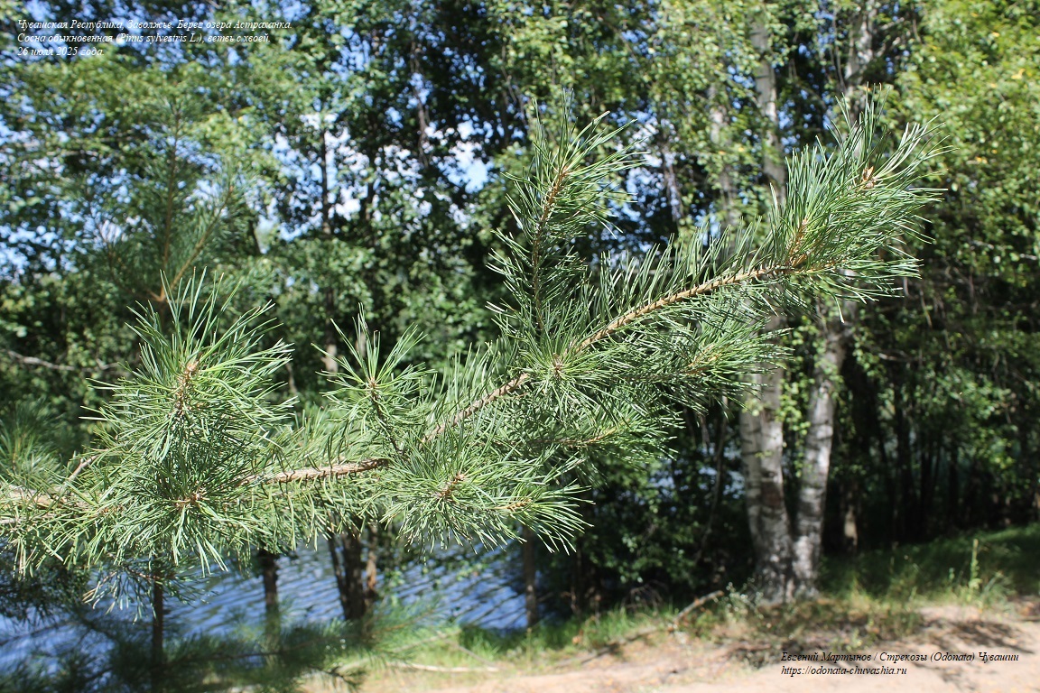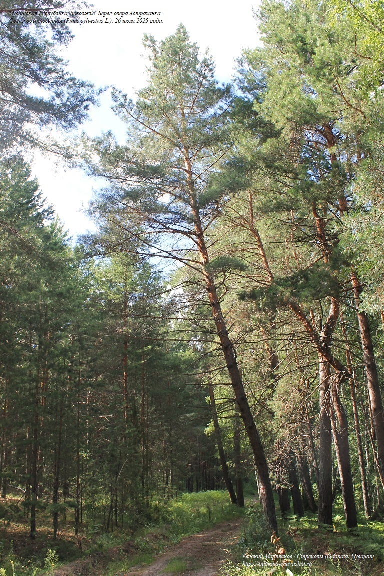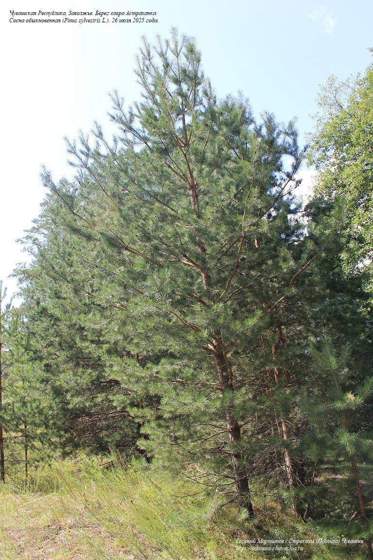 Озеро Астраханка, как и другие озёра чувашского Заволжья, расположено в подзоне южной тайги и со всех сторон окружено светлохвойным таёжным (сосновым) лесом. Доминирующей древесной породой в окружающем водоём древостое является сосна обыкновенная (Pinus sylvestris L.). На фотографии - общий вид взрослого дерева. На дополнительных фотоснимках - молодая сосна: общий вид, ветвь с хвоей и ствол дерева.