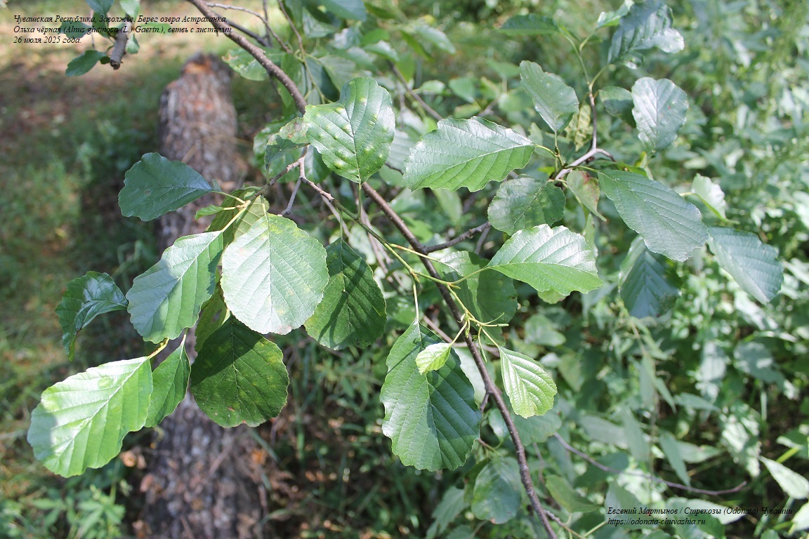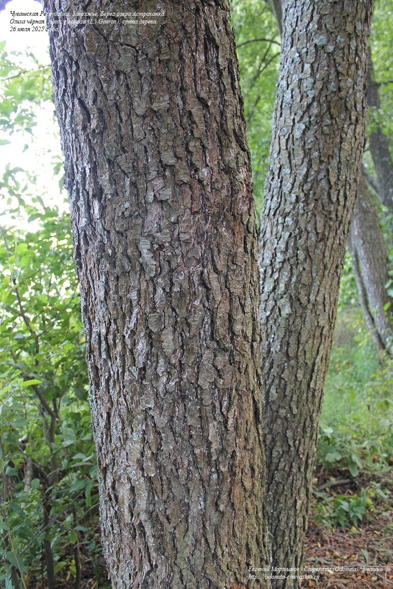 Ещё одна распространённая лиственная древесная порода на берегу озера - ольха чёрная (Alnus glutinosa (L.) Gaertn.). На фотографии - общий вид деревьев. На дополнительных фотоснимках - ствол и ветвь с листьями ольхи.