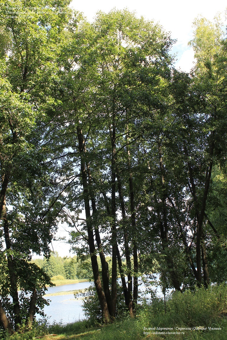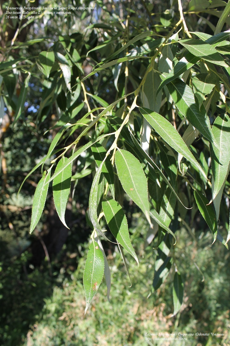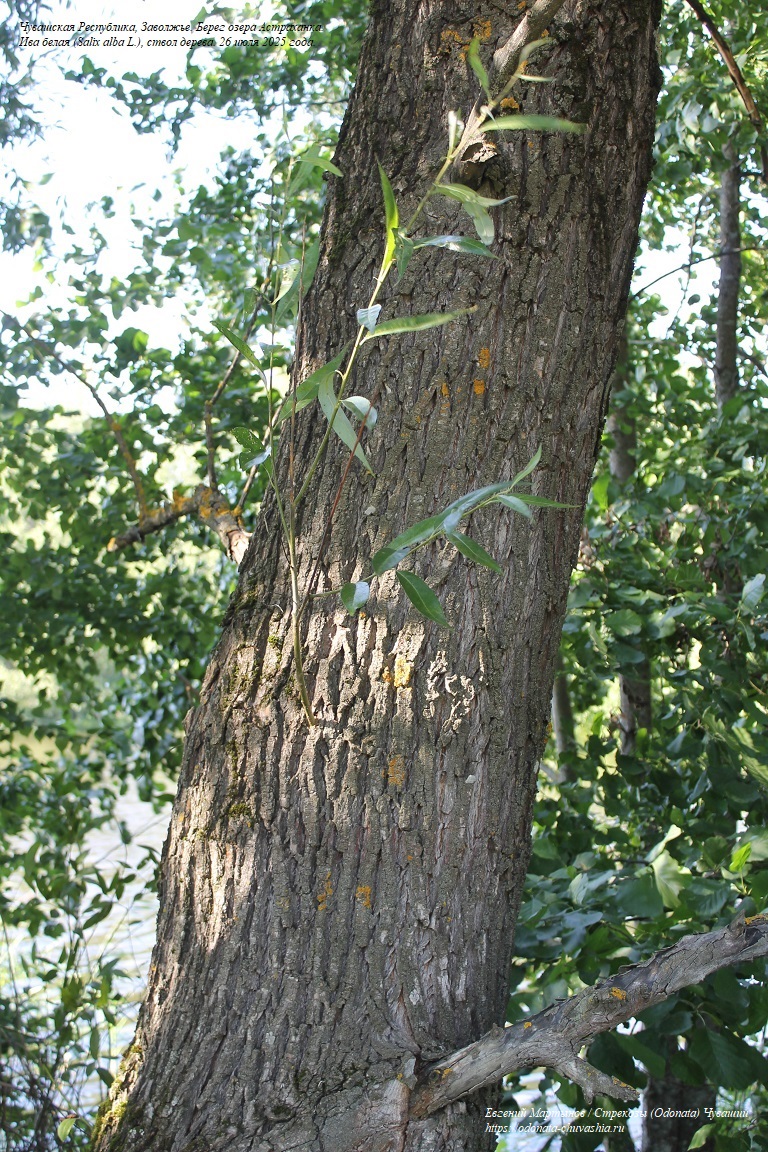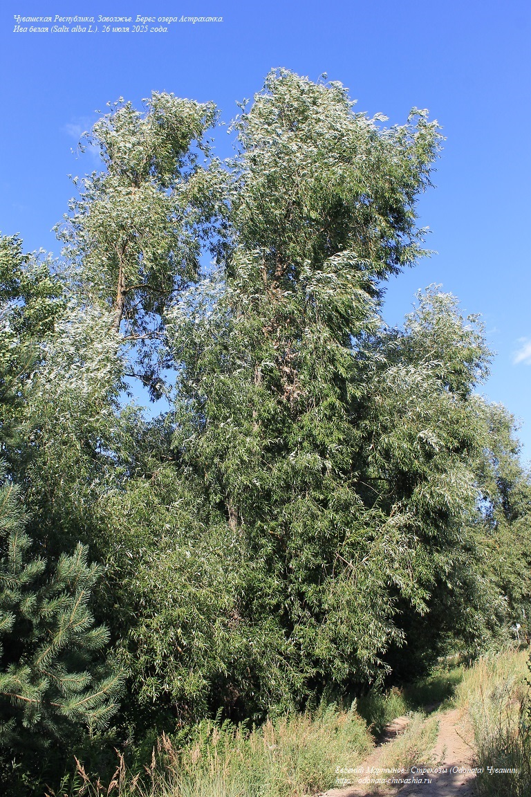 Тем не менее, вдоль берега Астраханки произрастает и немало лиственных пород деревьев. В частности, весь южный берег озера порос ивой белой (Salix alba L.). В общей сложности, здесь растёт около двух-трёх десятков взрослых деревьев. На фотографии - общий вид дерева. На дополнительных фотоснимках - ствол и ветвь с листьями ивы.