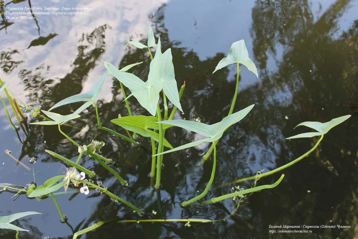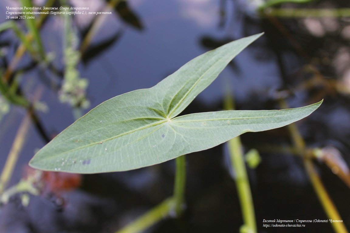 Одно из типичных водных растений, встречающихся на озере - стрелолист обыкновенный Sagittaria sagittifolia Linnaeus, 1753 (чуваш. название - ухă курăкĕ). На фотографии - общий вид растения; на дополнительном фотоснимке - лист стрелолиста крупным планом.