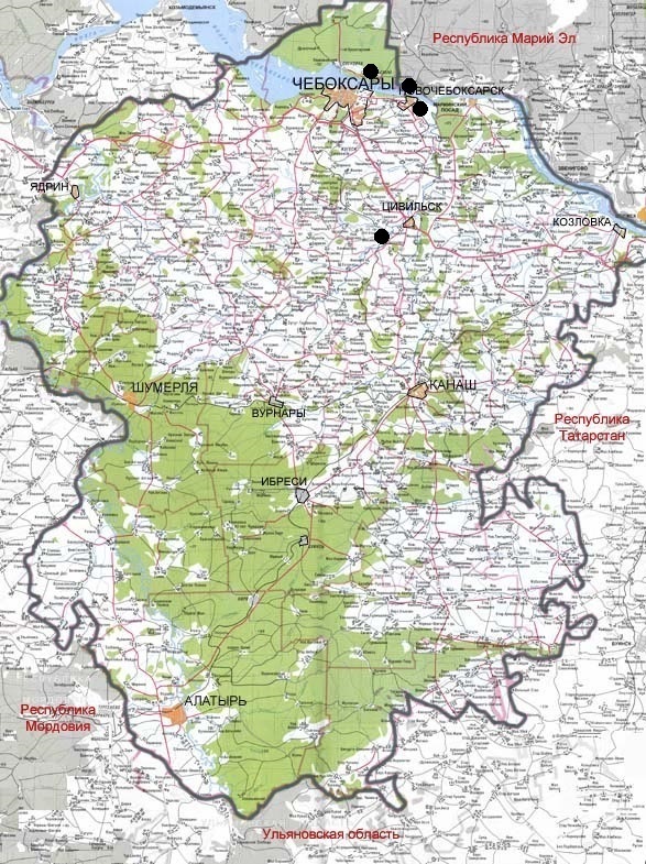 Места наблюдений и находок бабки желтопятнистой на территории Чувашии.