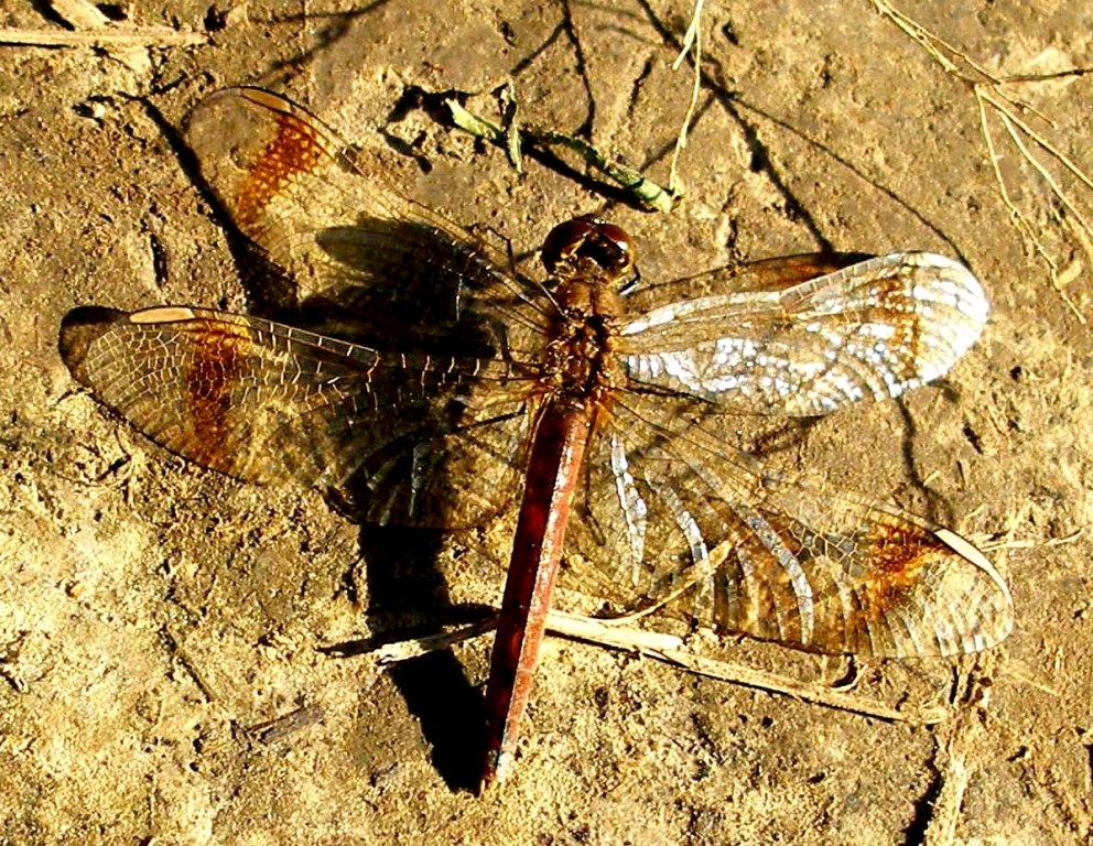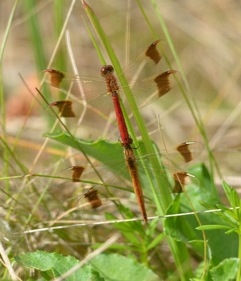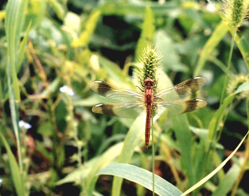 Также нижняя фотография. Самцы перевязанной стрекозы Sympetrum pedemontanum (Allioni, 1766). Верхний снимок - пруд на пустыре между ж/д станцией “Чебоксары-2” (окрестности улицы Железнодорожная города Чебоксары, 6 км ЮЗ центра) и пгт. Новые Лапсары, Чебоксары, Чувашия. 26 Августа 2006 года. Нижний снимок - окрестности деревни Тюмерево, Янтиковский район, Чувашия. 18 Августа 2004 года. Фотография Альберта Аркадьевича Ластухина.