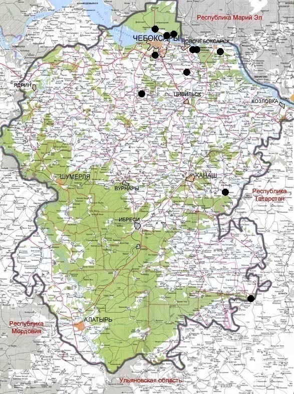 Места наблюдений и находок перевязанной стрекозы на территории Чувашии.