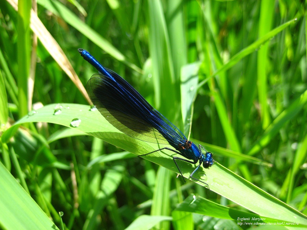 1) Красотка блестящая - Calopteryx splendens (Harris, 1782). Судя по наблюдениям, обычный вид на территории данного проточного водоема (визуальное наблюдение 4 самцов одновременно, на одном из участков берега; помимо этого, в прибрежной растительности была отмечена и самка). Снимок одного из самцов приведен выше.