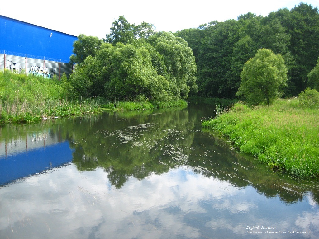От автора. Наблюдения выявили достаточно богатую фауну стрекоз (учитывая, что водоем находиться в ярко выраженной урбанизированной зоне - расстояние непосредственно до Москвы (МКАДа), по прямой, около 7,5 км). Вблизи водоема, помимо железной дороги, проходит оживленная автомобильная трасса (Носовихинское шоссе), помимо этого, располагается склад (виден на снимках), чуть поотдаль - несколько высотных жилых домов. Особенно неожиданной оказалась находка достаточно требовательной к качеству воды, и во многих местах редкой по численности красотки блестящей Calopteryx splendens (Harris, 1782). Следует отметить, что водоем оказался (во всяком случае, на данном участке), без видимых признаков загрязнения какими-либо химическими веществами (бензин, мазут, автомобильное масло и пр.). Вместе с тем, на берегу отмечен мусор (пластиковая посуда и бутылки), что, однако, типично для многих водоемов в населенных местностях.