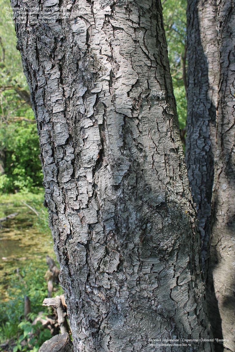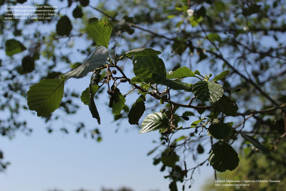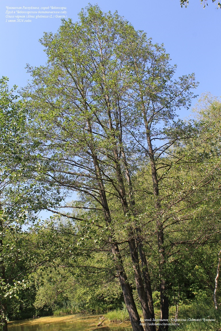 Ещё одна древесная порода, отмеченная вблизи пруда - ольха чёрная (Alnus glutinosa (L.) Gaertn.). На фотографии - общий вид взрослых деревьев. На дополнительных фотоснимках - ствол дерева крупным планом и ветвь с листьями ольхи.