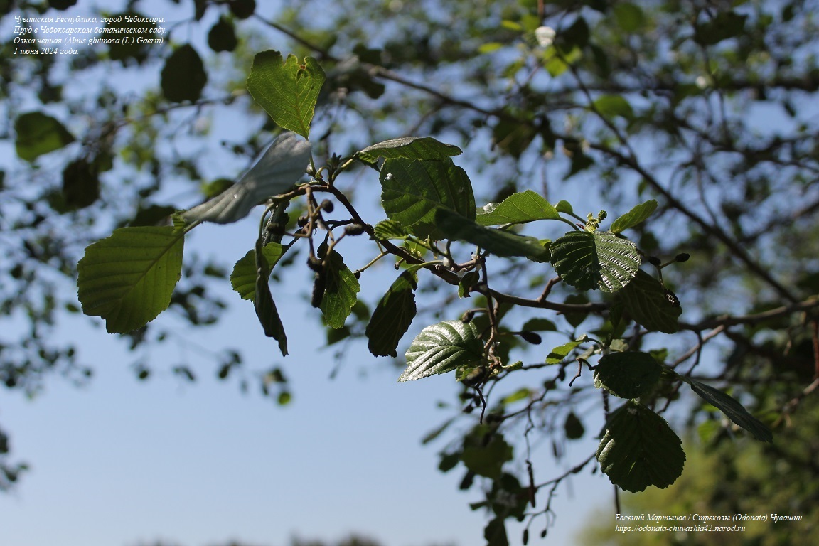 Ещё одна древесная порода, отмеченная вблизи пруда - ольха чёрная (Alnus glutinosa (L.) Gaertn). На верхней фотографии - общий вид взрослых деревьев; на средней фотографии - ствол дерева крупным планом; на нижней фотографии - ветвь с листьями ольхи.