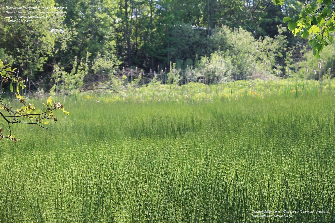 На своей западной окраине пруд обильно порос хвощом (Equisetum sp.), который практически полностью заполонил собой всю акваторию в этой части водоёма.
